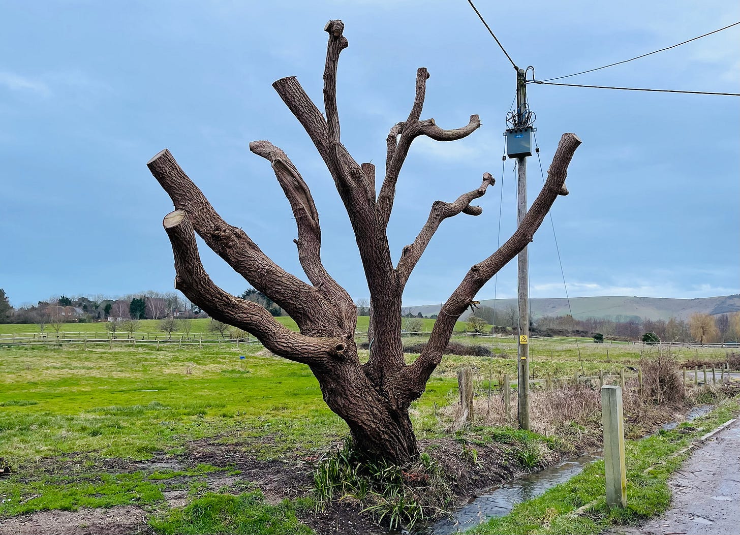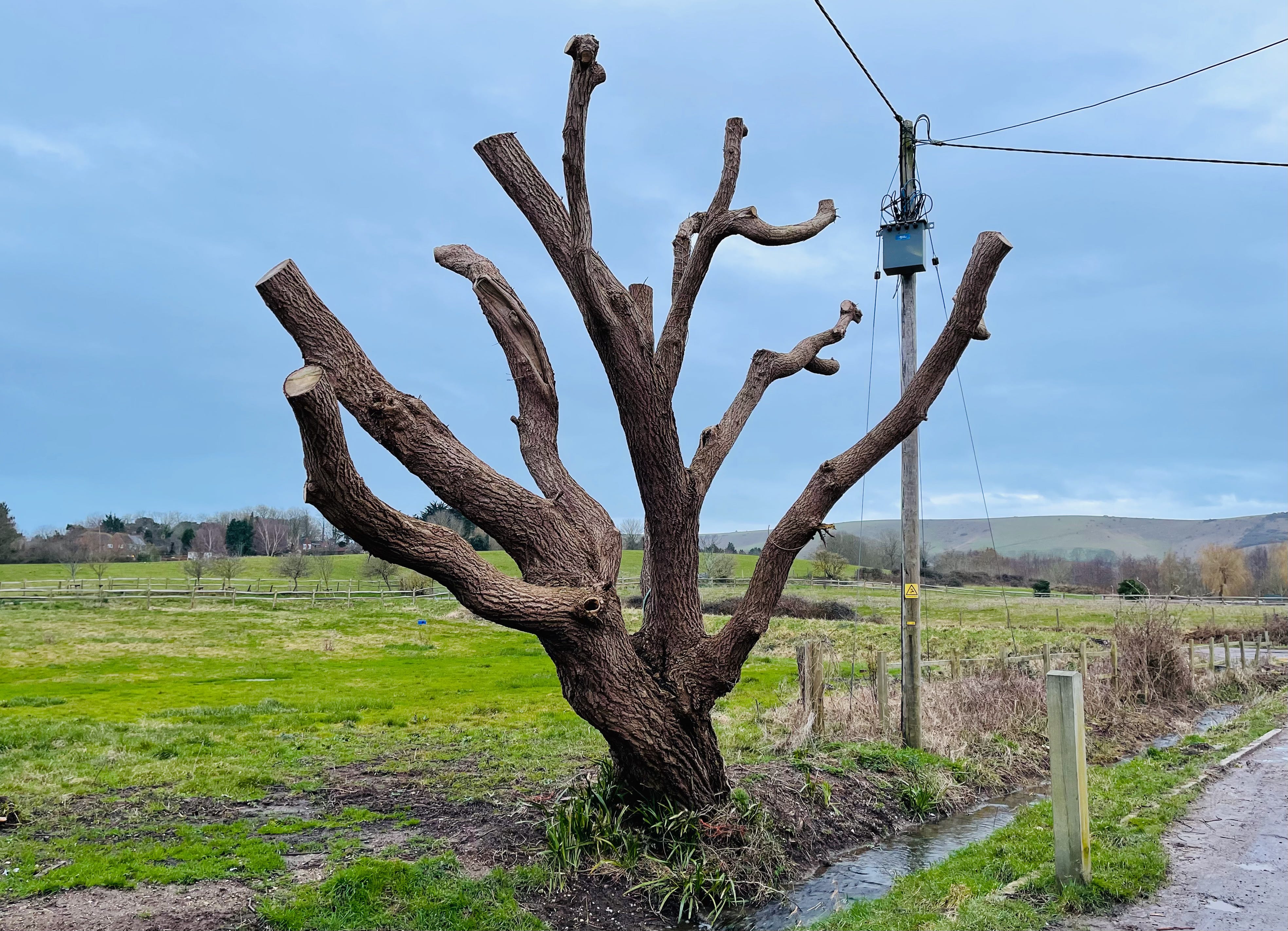 Suddenly, there’s a grey-blue blur and a pigeon wheels across the dimensions turning on its final approach right in front of me. Next to the tree in which the magpies no longer sit, a wreath of dark olive foliage piles like clouds. At the horizon the darker green tuft of a Scots pine stands sentinel.