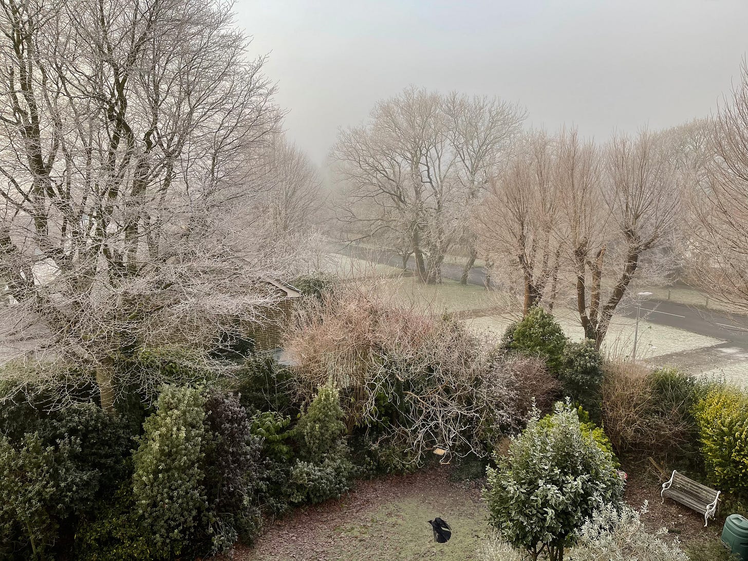 First Frost I wake in the half-light as his small warmth tumbles across me to snuggle on his mother’s side. I stand and stretch the wings she’s made me, who quietly enters and kneels beside him. This is why soldiers cry for their mothers. I furl the blind and let the day’s beginning fill the room. I open the window to the sound of footsteps to the train, delivery vans, cars, the thrum of traffic from the main road. Her focus is total on his tousled blonde head. He grins into the pillow. Half a pound of tuppenny rice, half a pound of treacle. That’s the way the money goes. Pop goes the weasel. He squeals in delight as her gentle fingers prod his small round tummy. I open the backdoor and once outside close it to savour the air and time, loving every second. In my gaze the moment’s harvest surprises me. The movement of dried leaves played by the breeze sings soundlessly of interconnection, the leaves of ash, horse chestnut, lilac, buddleia, repeat the song discreetly as if the wind inspires each tree in turn.